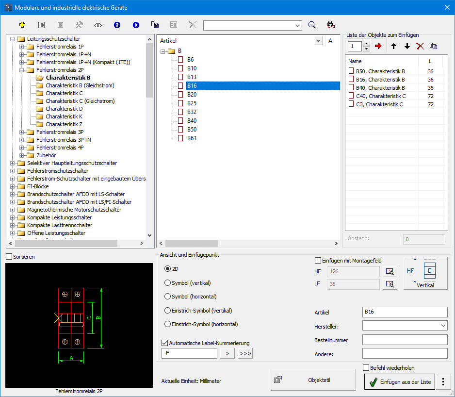 elektrische Schemen zur Verfügung. Beim Einfügen von Geräteansichten ist es