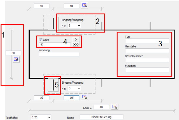 Bei der Definition eines SPS-Steuerungsblocks sollte der Benutzer seine Außenabmessungen und die Anzahl der Ein- und Ausgänge angeben. Nach dem Einfügen eines Blocks kann der Anwender jeden Ein- und Ausgang mit Hilfe der entsprechenden Zeichen beschriften.