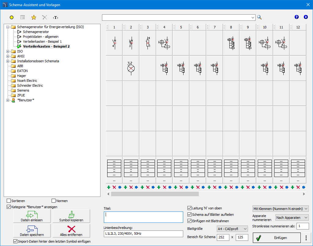 Mit dem Befehl „Schema-Vorlagen“ können vordefinierte Potenzial- und Schaltungslinien in das Projekt eingefügt werden, mit denen sich schnell Schemata erstellen lassen.