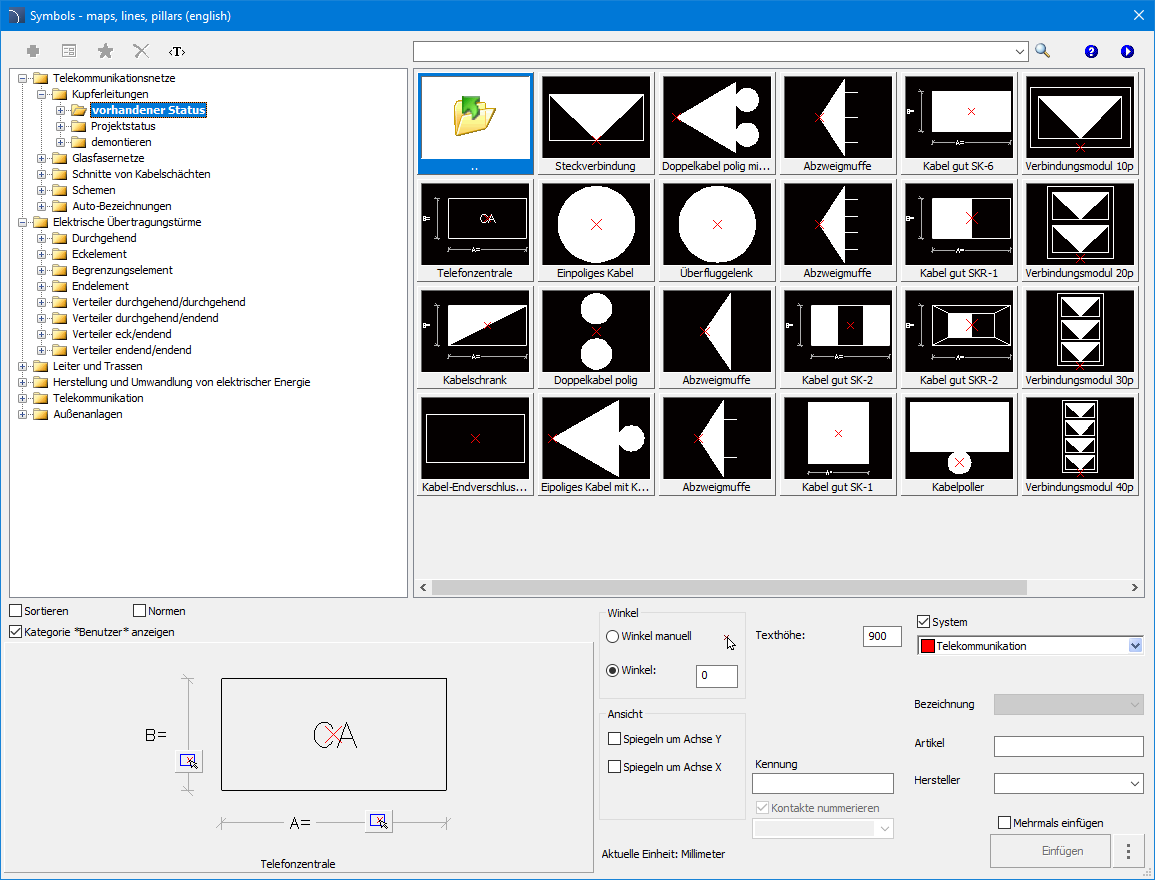 Beim Einfügen von Verteilerzentren werden auch Tabellen eingefügt, in denen Name, Nummer und Schaltkreisparameter angegeben werden. Um diese Daten zu bearbeiten, kann der Benutzer den Befehl „Symbole bearbeiten” oder andere Befehle zum Bearbeiten von Blockattributen verwenden.