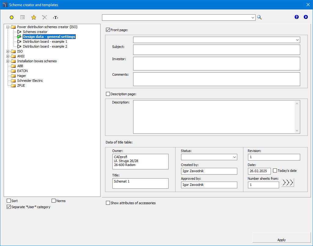 Eine besondere Gruppe von Schemata sind Verteilerzentren – Stromkreise. Es sind Sätze mit mehreren Stromkreisen sowie einzelne Beleuchtungs- oder Steckdosenstromkreise verfügbar. Dank dieser Funktion kann der Benutzer sofort verschiedene Verteilerzentrumsschemata erstellen. Steckdosen- und Beleuchtungsstromkreise können für andere Arten von Stromkreisen verwendet werden ( ) – nach dem Einfügen eines solchen Stromkreises muss der Benutzer lediglich die Beschreibung und das Empfängersymbol ändern.
