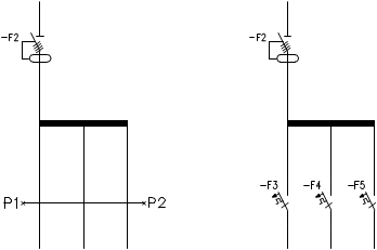 Die Option In mehrere Leitungen einfügen ermöglicht das schnelle Einfügen des gewählten Symbols in mehrere Leitungen. Sie erlaubt das Symbol in alle Leitungen einzufügen, die von der „Schnittlinie ” gekreuzt werden, die beim Einfügen angegeben wird (P1–P2).
