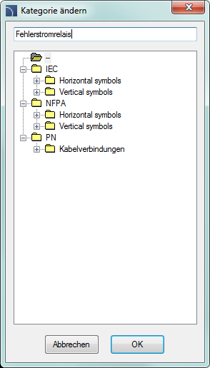 Im Dialogfenster kann der Nutzer eine vorhandene Kategorie auswählen oder einen neuen Kategorienamen eingeben. Nach der Bestätigung wird das gewählte Symbol in die neue Kategorie verschoben. CADprofi erlaubt viele Kopien von jedem Symbol zu erstellen und es in verschiedenen Kategorien zu platzieren. Deshalb kann der Nutzer Kategorien erstellen, die Symbole für bestimmte Typen gruppieren oder für häufig verwendete Symbole eines bestimmten Gewerks. |