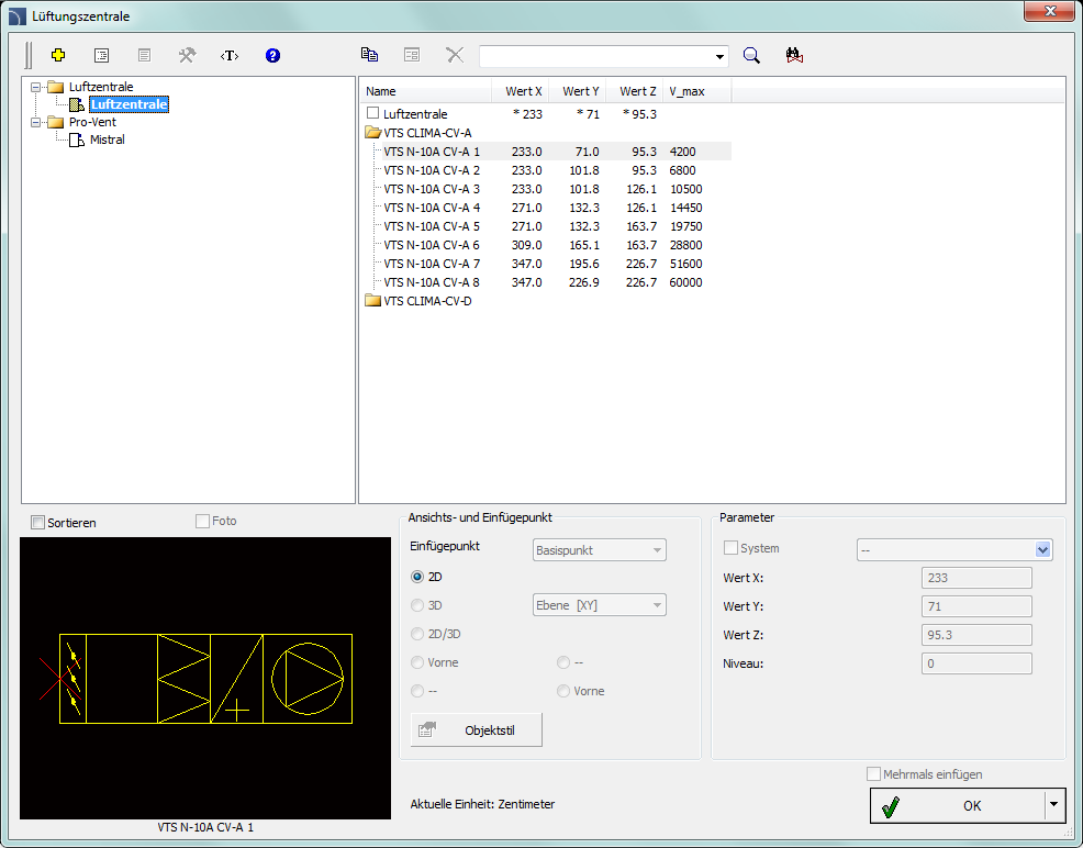 Der Befehl Lüftungszentrale ermöglicht das Einfügen von Lüftungszentralen in der 2D-Ansicht.