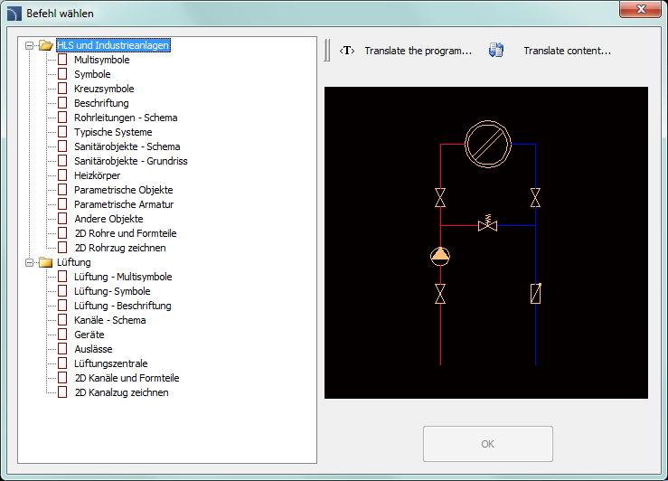 Der Befehl HLS und Industrieanlagen öffnet ein Dialogfenster, aus dem wir die entsprechenden Befehle aus den Modulen HLS und Industrieanlagen und Lüftung auswählen können. Dieser Befehl ist für Anfänger vorbereitet. Im Dialogfenster aller Befehle finden wir neben der Liste auch einen großes Vorschaufenster, das den Umriss der ausgewählten Funktion zeigt.