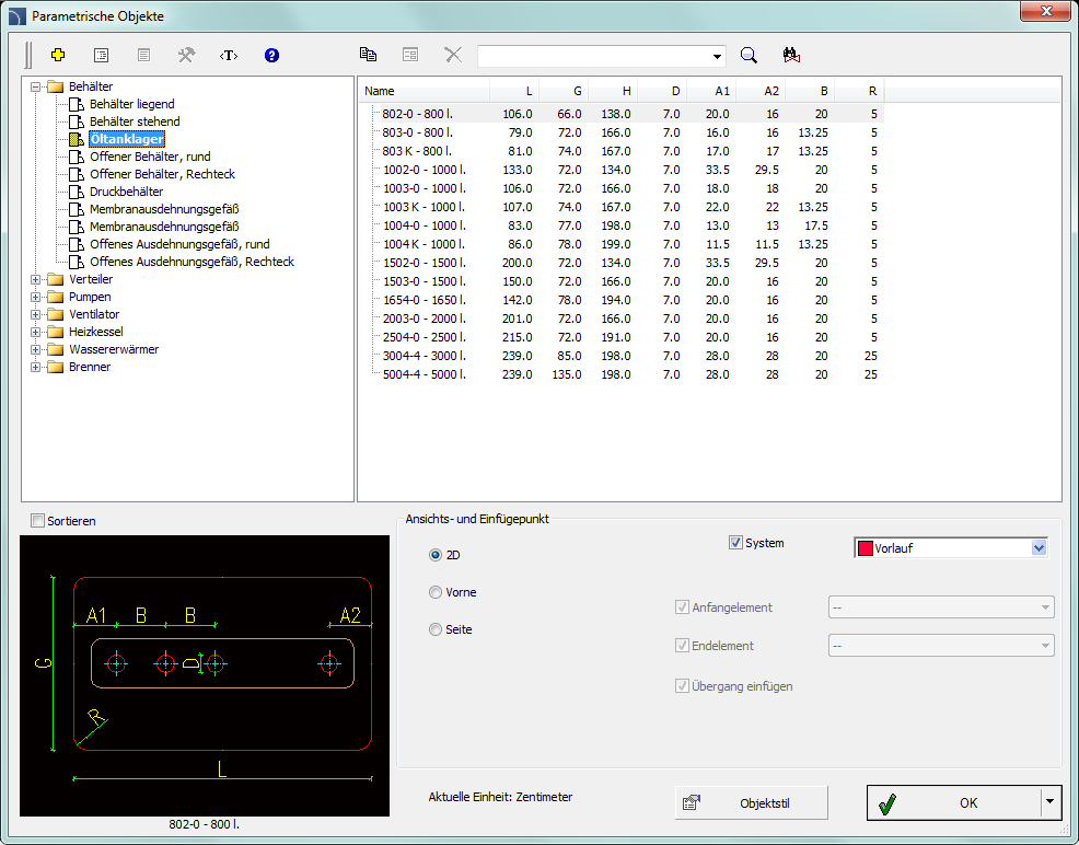 Der Befehl Parametrische Objekte wird für das Einfügen verschiedener Objekte wie Tanks, Ventile, Pumpen, Lüfter, Heizkessel, Warmwasserbereiter usw. in das Projekt verwendet. Diese Objekte werden meistens nicht in Leitungen eingefügt.