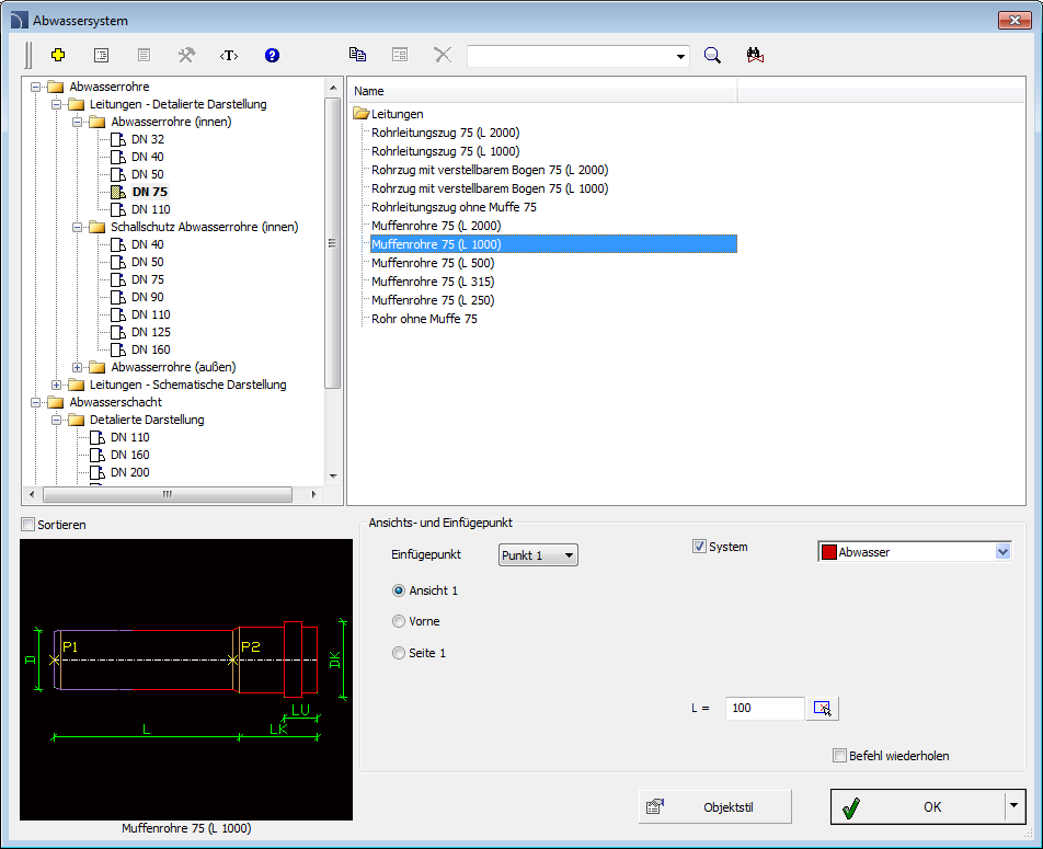 Es ist möglich Herstellerbibliotheken zu nutzen (z.B. Wavin enthält PVC, AS und geschweißte HD-PE Elemente) die in der Hersteller Bibliothek verfügbar sind.