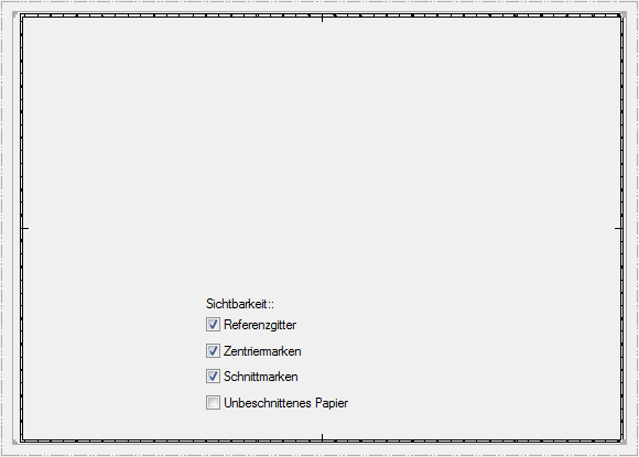 Die Rahmensichtbarkeit kann für folgende Optionen ein- oder ausgeschaltet werden: Referenzgitter, Zentriermarken, Schnittmarken und Unbeschnittenes Papier.