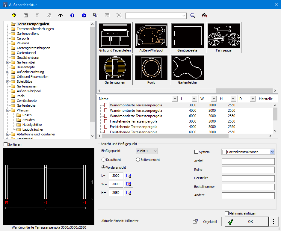 große Objekte in Architekturentwürfe einfügen, wie z. B. Pavillons, Vordächer,