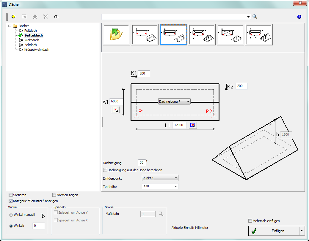 •Einfügepunkt – Auswahl des Einfügepunktes für das Dach (möglich ist P1 oder P2).
