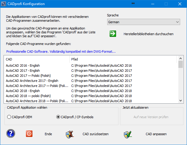 Gefundene CAD-Programme – Liste aller auf dem Computer installierten CAD-Programme, die CADprofi automatisch konfigurieren kann.