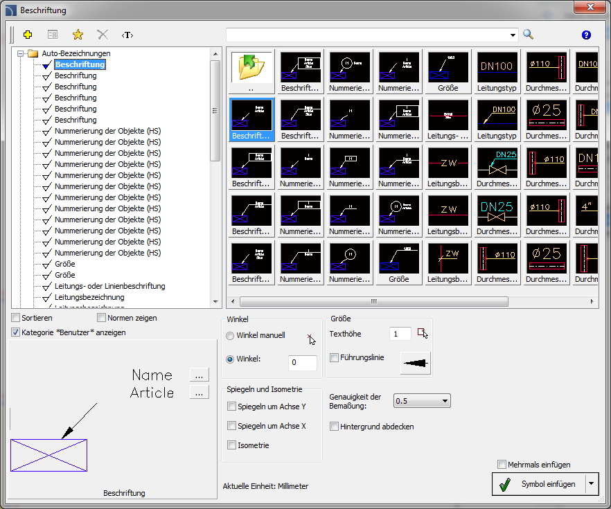 Symbole, die Informationen von Objekten sammeln und entsprechende Beschriftungen in die Zeichnung einfügen, werden dafür eingesetzt. Beim Einfügen automatischer Beschriftungen sollte der Nutzer das Objekt wählen und den Platzierungspunkt der Beschriftung angeben.