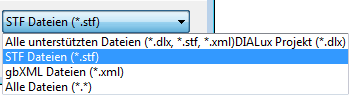 Die Übergabedatei *.STF lässt sich im DIALux direkt aus dem Menü Öffnen einlesen. Wählen Sie dafür in der folgenden Dialogbox das Format *.STF.