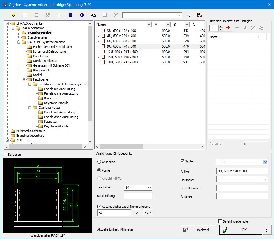 Dialogfenster "Objekte – Systeme mit extra niedriger Spannung (ELV)"