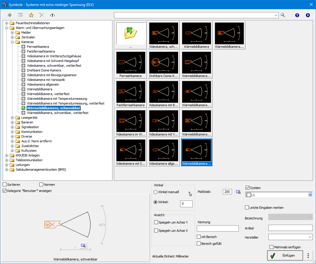 Der Befehl Symbole – Systeme mit extra niedriger Spannung (ELV) enthält Symbole, die in Projekten für Brandschutzanlagen, Alarm- und Überwachungsanlagen, KNX/EIB, Telekommunikationsanlagen und anderen Anlagen verwendet werden.