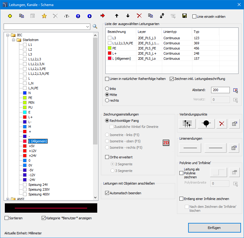11. (Optional) Ist in der Liste der ausgewählten Leitungsarten nur ein Objekt enthalten, dann ändern Sie die Zeichnungseinstellungen.