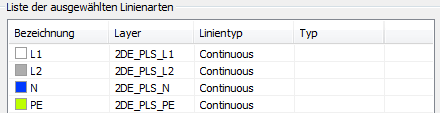 Liste der ausgewählten Leitungsarten – enthält Leitungen, die nach Klick auf OK gezeichnet werden.