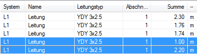 Die in den Steigleitungen gespeicherten Daten werden in die Stückliste übernommen, wenn der Anwender die Vorlage „Elektro – Leitungen” (siehe Seite \* MERGEFORMAT 82) verwendet.