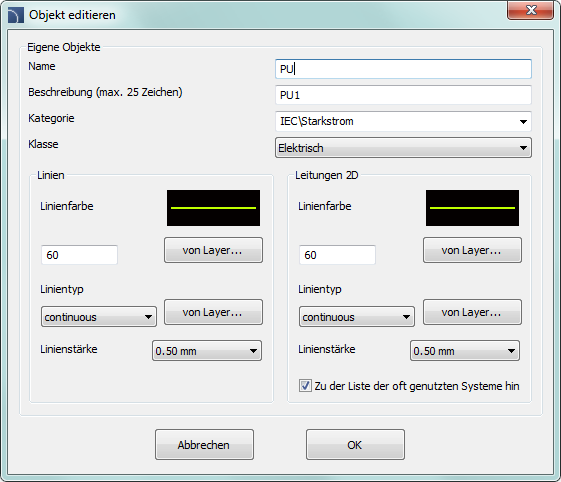 4. Bearbeiten Sie die neue Leitung mit dem Befehl Objekt editieren um den Namen und andere Parameter anzupassen.