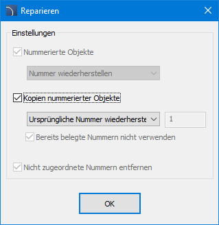 Von der ersten freien Nummer neu nummerieren – Mit dieser Option kann der Benutzer kopierten Objekten neue Nummern zuweisen, beginnend mit der ersten freien Nummer.