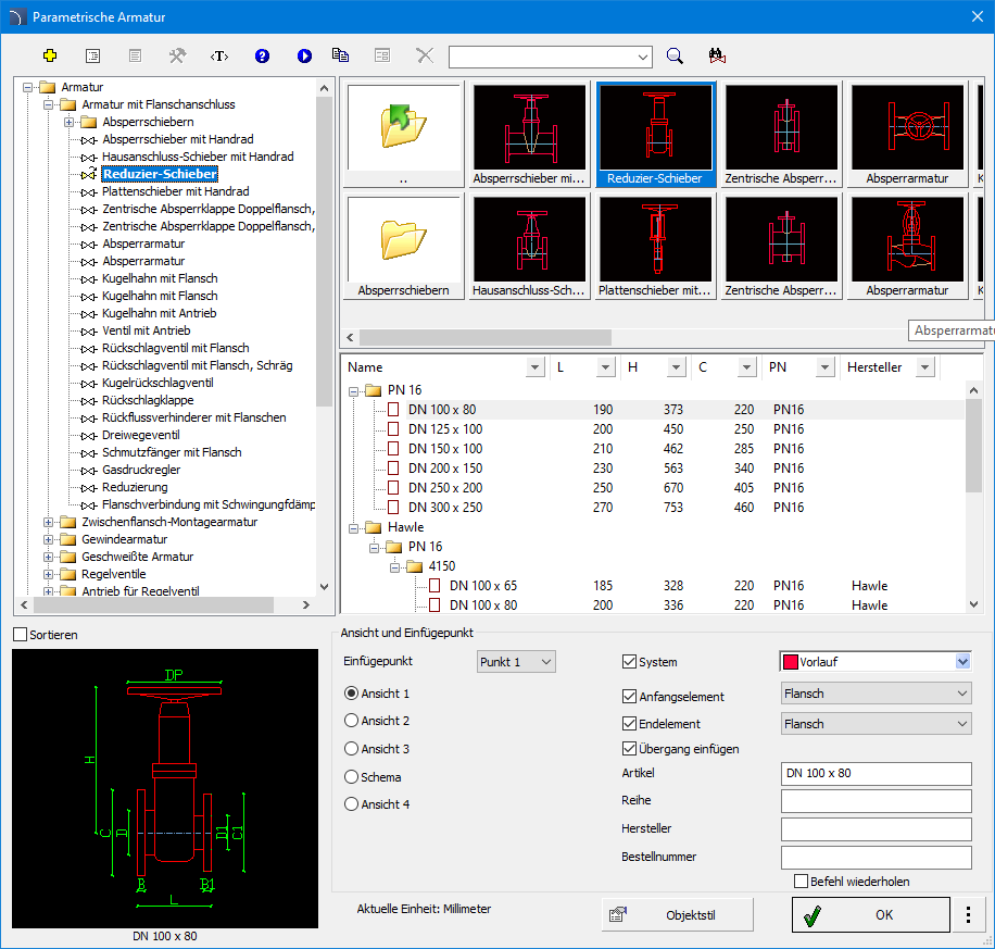 2. Wählen Sie im Dialogfenster Parametrische Armatur die gewünschte Objektkategorie. Danach wird die Elementvoransicht angezeigt und in der detaillierten Liste können Sie die verfügbaren Elementtypen und –größen sehen.