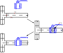 Gewindearmatur mit Nenndurchmesser kleiner als der Leitungsdurchmesser mit eingeschalteter Option Übergang einfügen (automatische Übergangseinfügung).