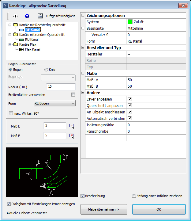 Die Befehle Rohrleitungen – allgemeine Darstellung und Kanalzüge – allgemeine Darstellung ermöglichen die Erstellung von Rohrzügen mit automatischem Einfügen von Bögen, dessen Parameter durch den Nutzer definiert werden. Diese Befehle haben die Möglichkeit, die Anzeige des Dialogfensters abzuschalten, um dem Nutzer den sofortigen Start des Zeichnens zu ermöglichen. In diesem Fall wird der Leitungszug mit den zuletzt verwendeten Parameter (oder bei aktivierten Optionen Layer anpassen und Durchmesser anpassen, mit den Einstellungen vom Start-Objekt) erstellt.