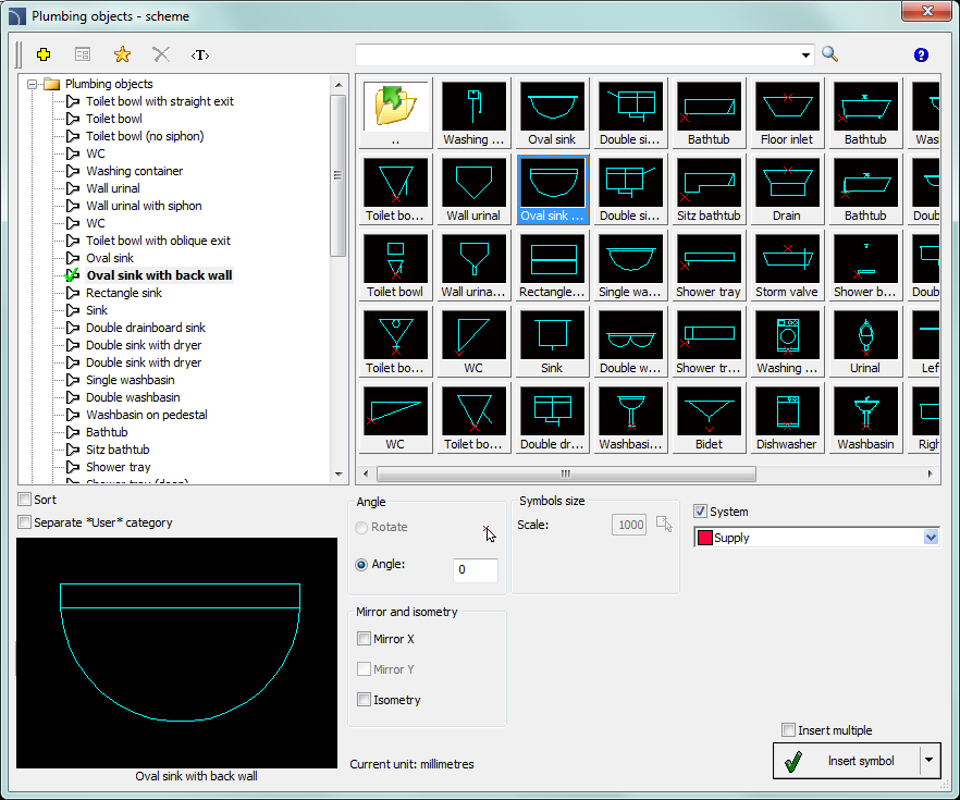 2. Wählen Sie im Dialogfenster „Sanitärobjekte – Schema“ das gewünschte Symbol aus der entsprechenden Kategorie aus.