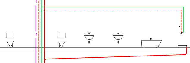 Der erste Schritt besteht darin, einen schematischen Querschnitt der Decken zu zeichnen. Der Querschnitt kann mit dem Befehl „Wände” (siehe S. 142) oder mit normalen Linien gezeichnet werden. Führen Sie im nächsten Schritt den Befehl „Rohrschema” (siehe S. 196) aus und zeichnen Sie die Wasser- und Abwassersteigleitungen. Anschließend können Sie die Sanitärarmaturen einfügen.