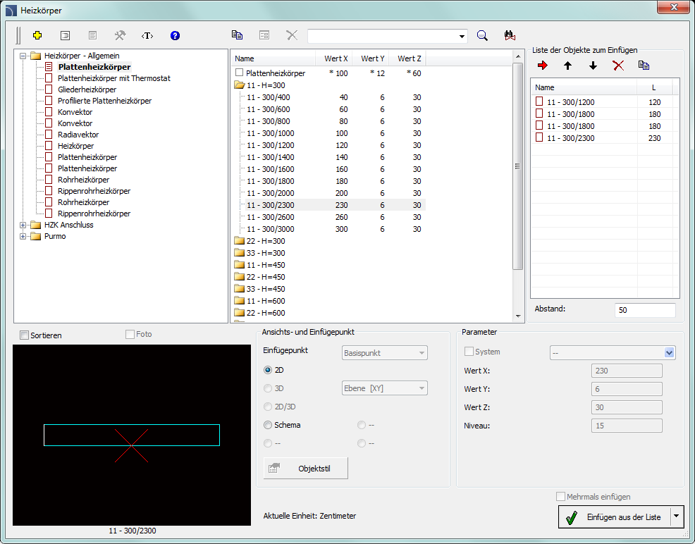 Mit diesem Befehl hat der Nutzer die Möglichkeit eine Liste von Objekten zum Einfügen zu erzeugen, mit der er mehrere unterschiedliche Heizkörper gleichzeitig einfügen kann.