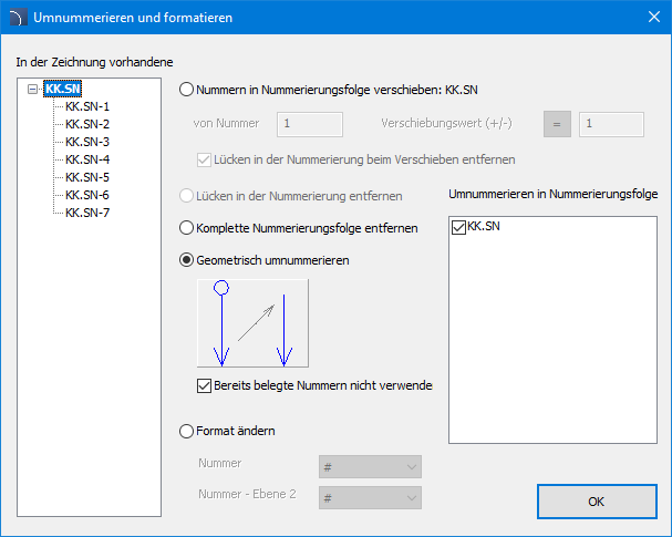 Mit dem Befehl „Nummerierung – Linien und Objekte” kann der Benutzer verschiedene Operationen mit Nummern durchführen. Eine davon ist die Umnummerierung. Die Operation ist möglich, wenn in der aktuellen Zeichnung bereits nummerierte Objekte vorhanden sind.