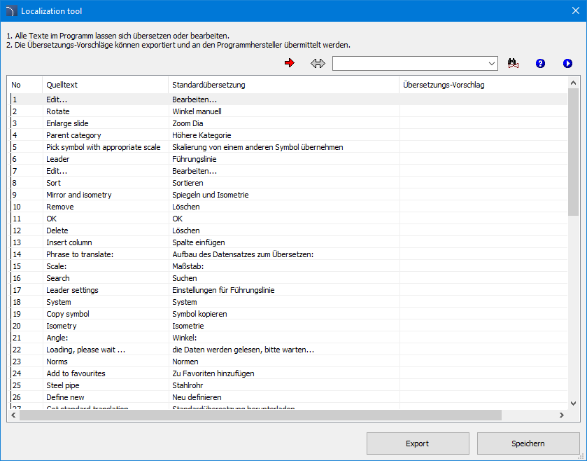 Bei der Übersetzung von kontextbezogenen Übersetzungen zeichnet das System alle vom Programm verwendeten Texte auf und stellt sie zur Übersetzung bereit. Auf diese Weise ist es möglich, alle Texte zu übersetzen, die bei „normaler“ Verwendung des Programms durch den Benutzer sichtbar sind. Neben den Standardtexten enthält das CADprofi-Programm auch viele zusätzliche Meldungen, die sporadisch erscheinen (z. B. Meldungen über eine fehlerhafte Programmfunktion). Die beste Möglichkeit, diese Texte zu übersetzen, ist die Anzeige einer vollständigen Textliste, in der der Benutzer den zu übersetzenden Text leicht finden kann.