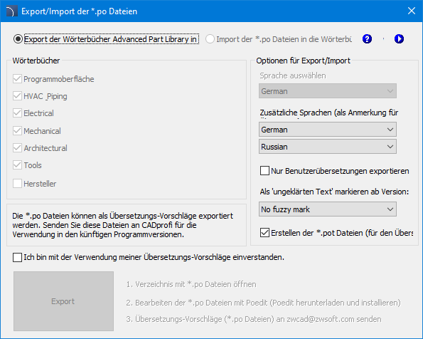 2. Wählen Sie die Option „CADprofi-Wörterbücher in *.po-Dateien exportieren”.
