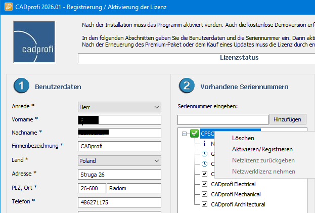 Dialogfenster „CADprofi Registrierung / Aktivierung der Lizenz”