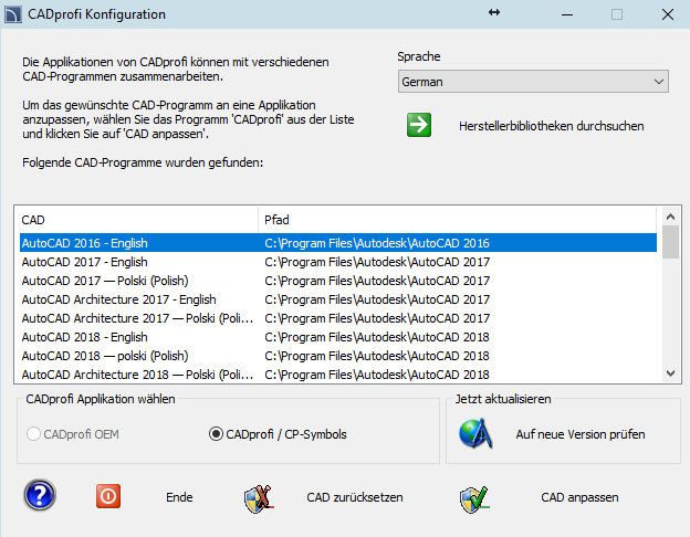 Wählen Sie im Konfigurationsprogramm das verwendete CAD-Programm aus (z.B. AutoCAD, BricsCAD, GstarCAD, ZWCAD oder andere) und drücken Sie dann die Schaltfläche "CAD zurücksetzen".