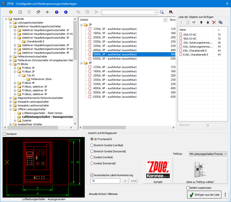 Diese Bibliothek enthält Mess- und Regelgeräte, Niederspannungs-Verteilgeräte und Niederspannungs-Schaltanlagen vom Typ ZR-W der Firma ZPUE.