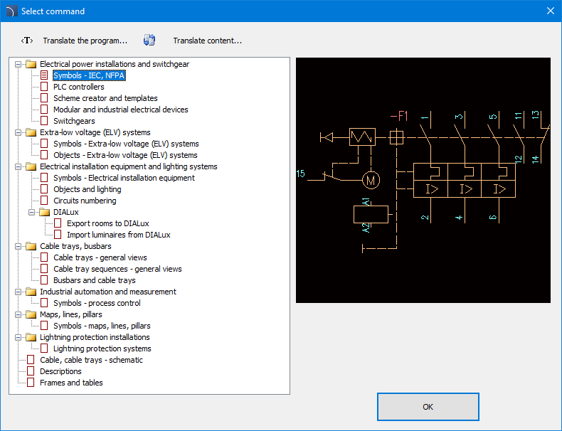 The Electrical command opens the dialog window from which we can choose the appropriate commands from the Electrical module. This command has been prepared for beginners. In the dialog window apart from the list of all commands we can also find a large preview window that shows the outline of the selected function.