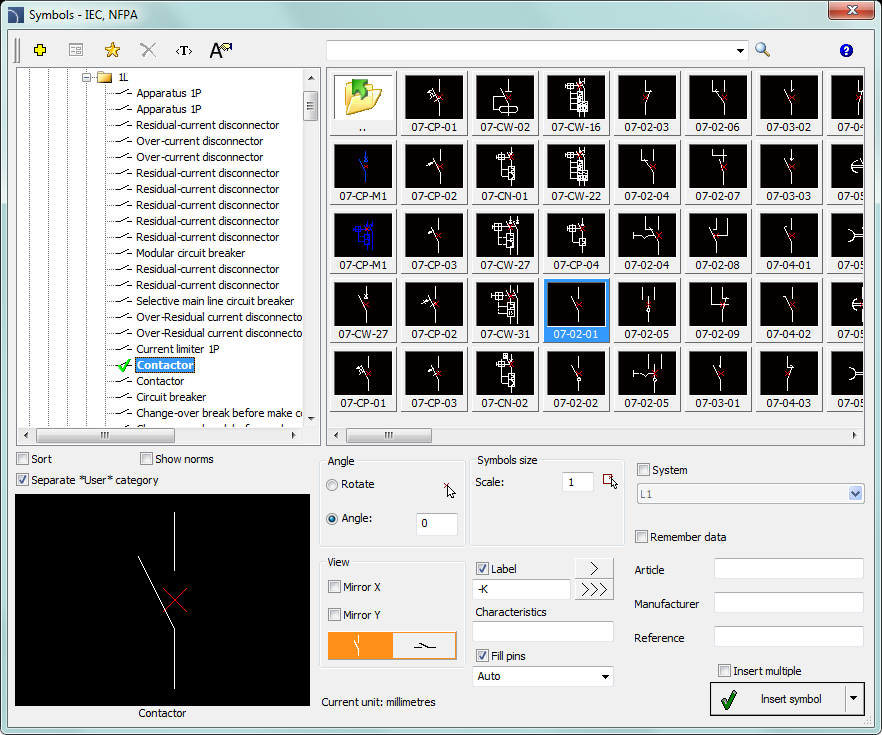 The Symbols - IEC, NFPA command allows to insert control gear, switchgear, complex apparatus, measuring instruments and many additional symbols and elements that are used in electrical installations scheme. In the library there are symbols from both IEC and NFPA standards available.