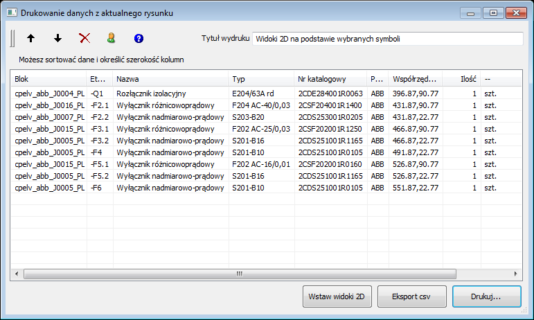Polecenie Zestawienia materiałów pozwala także na automatyczne generowanie widoków aparatów na podstawie symboli użytych w schematach. Służy do tego specjalne zestawienie ABB - Widoki 2D na podstawie wybranych symboli. Po wybraniu tego rodzaju zestawienia należy kliknąć przycisk Dalej > i wybrać obszar zawierający żądane symbole. Po zatwierdzeniu wyboru (klawiszem Enter) wyświetlona zostanie lista wybranych produktów. Kolejność produktów na liście jest zgodna z kolejnością symboli na schemacie, dlatego najczęściej nie jest zalecane porządkowanie tej listy.