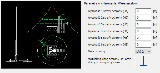 Wymiarowanie – umożliwia precyzyjne wyznaczenie stref ochrony masztu metodą stożka (kąt ochronny) dla jednego masztu, a także metodą toczącej się kuli dla jednego masztu oraz wielu masztów w czterech klasach ochrony LPS. Na każdym etapie projektu program umożliwia wprowadzenie korekt rozmieszczonych masztów, automatycznie przeliczając wyznaczone strefy ochrony według zadanych parametrów (wysokości chronionych urządzeń oraz klasy LPS).