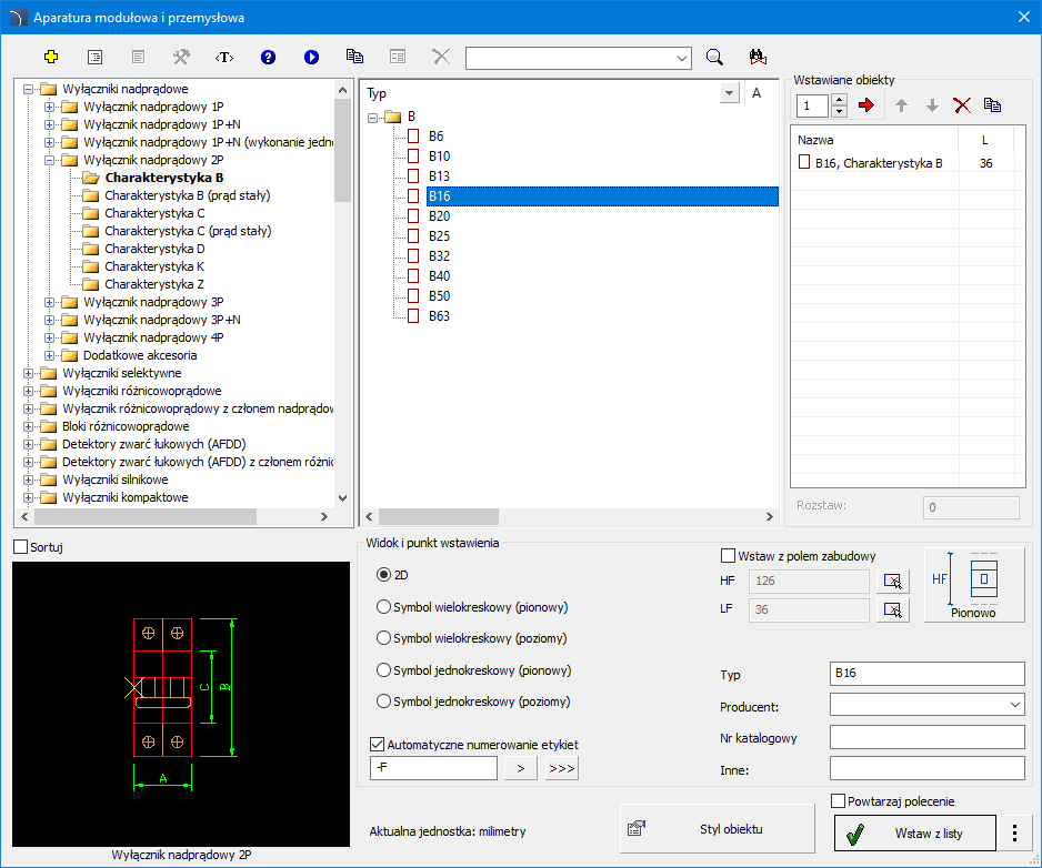 Polecenie Aparatura modułowa i przemysłowa zawiera wiele typów aparatury łączeniowej, zabezpieczającej i innych elementów wykorzystywanych w projektach elektrycznych. Dla wszystkich aparatów dostępne są widoki stosowane przy projektowaniu rozdzielnic oraz symbole stosowane na schematach. W przypadku wstawiania widoków aparatów możliwe jest stworzenie listy wstawianych obiektów, która służy do jednoczesnego wstawiania do rysunku wielu obiektów.