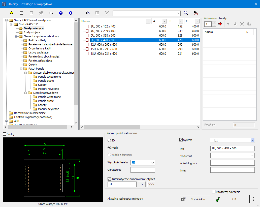 Okno dialogowe "Obiekty - instalacje niskoprądowe"