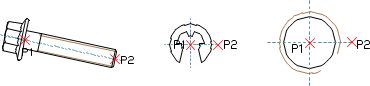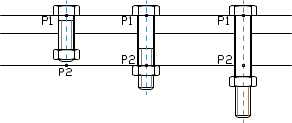 Aby wstawić połączenie śrubowe należy w oknie dialogowym wybrać odpowiedni typ połączenia oraz żądaną wielkość śruby. Następnie należy na rysunku wskazać punkt wstawienia (P1) oraz grubość połączenia (P2).