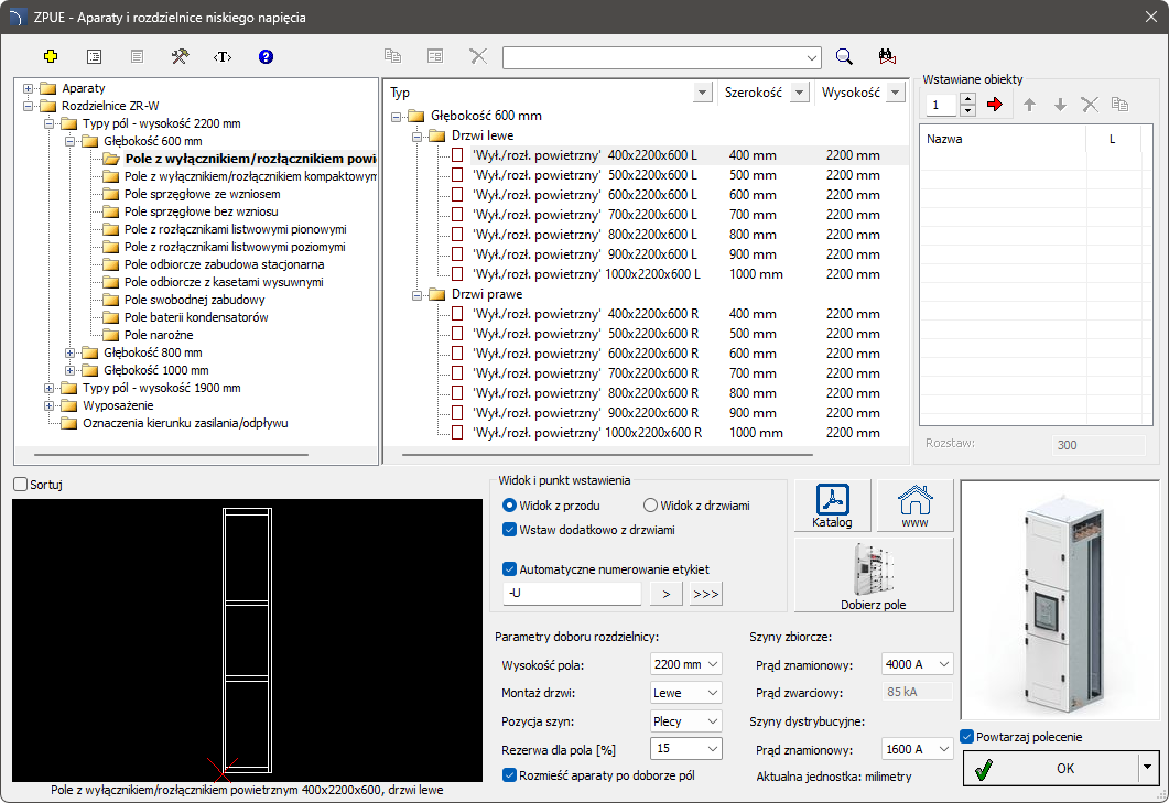 Okno dialogowe ZPUE – „Aparaty i rozdzielnice niskiego napięcia”