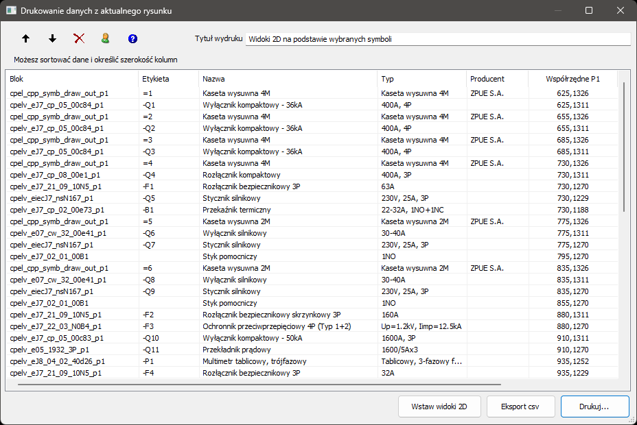 Polecenie Zestawienia materiałów pozwala także na automatyczne generowanie widoków aparatów oraz kaset wysuwnych na podstawie symboli użytych w schematach. Służy do tego specjalne zestawienie ZPUE - Widoki 2D na podstawie wybranych symboli. Po wybraniu tego rodzaju zestawienia należy kliknąć przycisk Dalej > i wybrać obszar zawierający żądane symbole. Po zatwierdzeniu wyboru (klawiszem Enter) wyświetlona zostanie lista wybranych produktów. Kolejność produktów na liście jest zgodna z kolejnością symboli na schemacie, dlatego najczęściej nie jest zalecane porządkowanie tej listy.