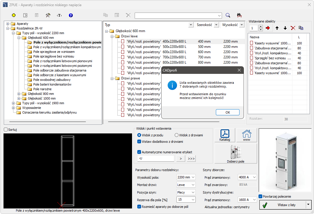 6. W oknie dialogowym programu tworzona jest lista z odpowiednią ilością i rodzajem dobranych sekcji rozdzielnic.