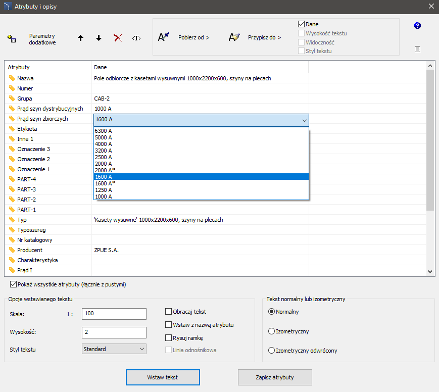 edycję wszystkich atrybutów w tym m. in. wartości szyn prądowych. Wszystkie dane